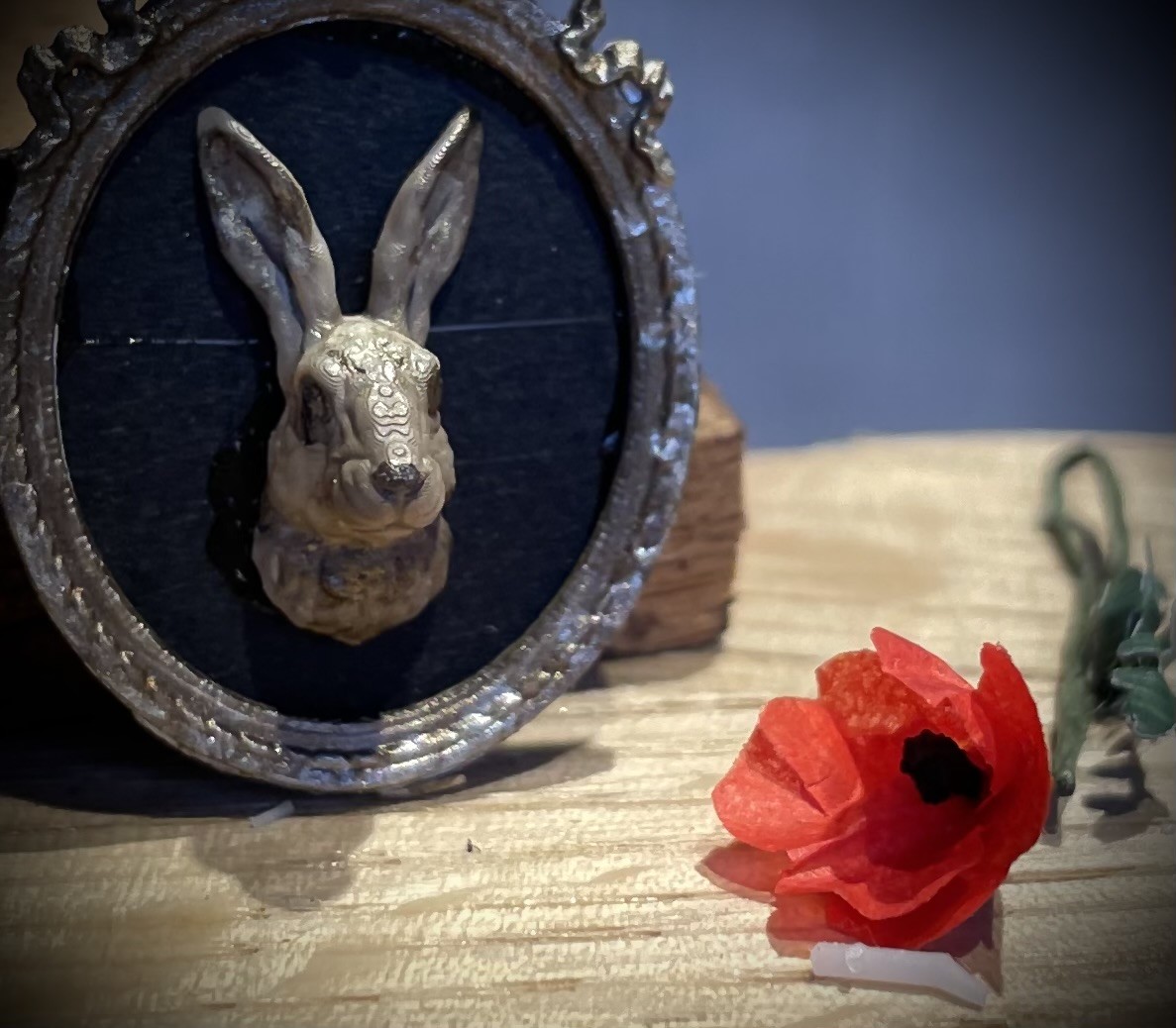 Hare head that can be placed on a wall or in a frame. The head is 1,5 cm tall and is made of resin. The head is available painted or unpainted