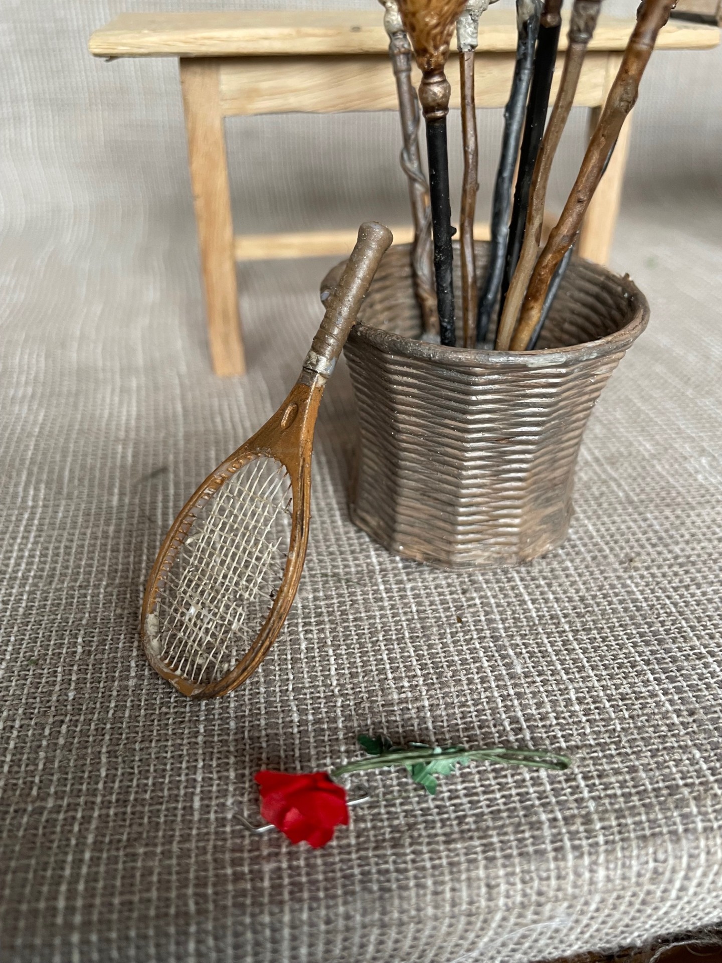 Old used tennis racket that has played its last game and is only now used for show. The strings are a broken but it still looks good. The racket is made of Resin and is unpainted.