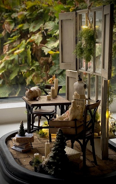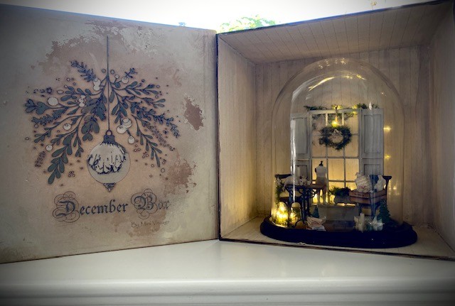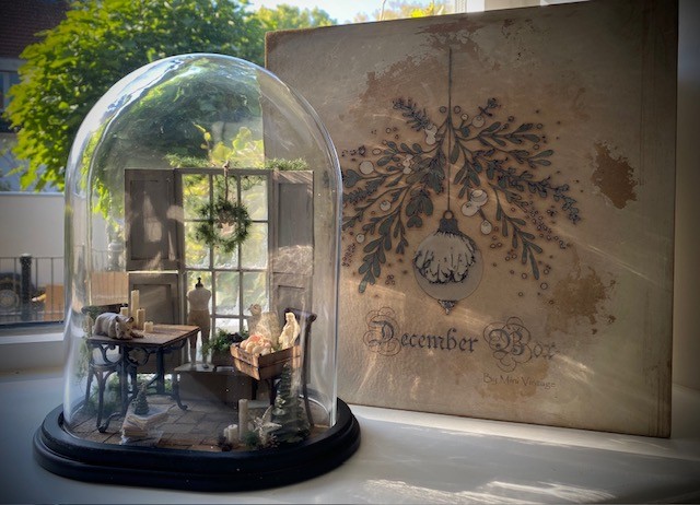 The box contains a thick glass dome with a black base. And everything you see in the photo under the dome is included, unfinished. A note is enclosed with the contents and some tips and tricks, but the idea is really that you add your own touch. So no wallpaper, paint, or color advice.