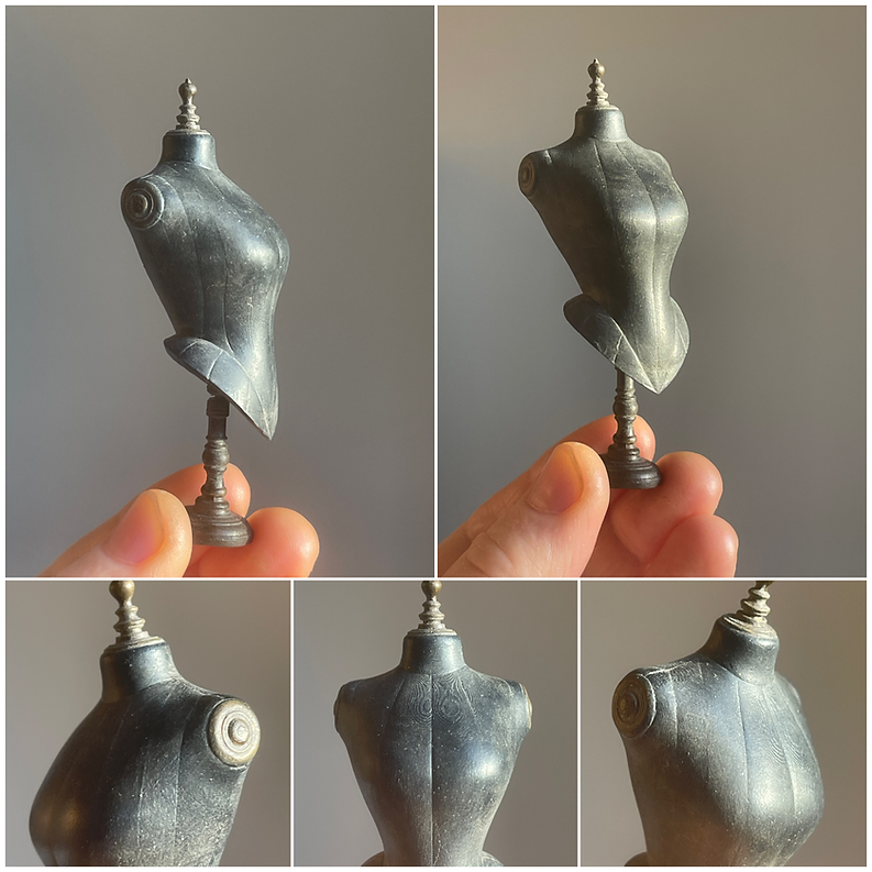 The silhouette of this table mannequin is typical for the years around 1885 to 1895. The original torso was covered in black weave muslin and presented on a round wood stand.