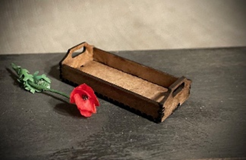 Klein dienblad voor thuis, altijd handig! Het dienblad (kit) is gemaakt van MDF, onafgewerkt en heeft de afmetingen 4 cm x 1,7 cm en is 0,8 cm hoog