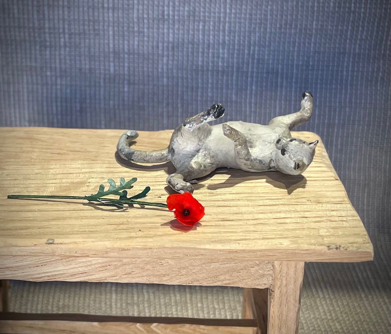 Speelse kat liggend op haar rug. De kat is gemaakt van Resin en is ongeveer 5 cm lang vanaf het puntje van de staart tot de bovenkant van het hoofd. Het artikel is ongeverfd