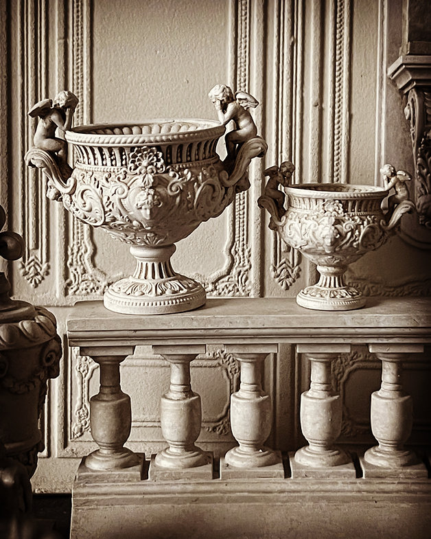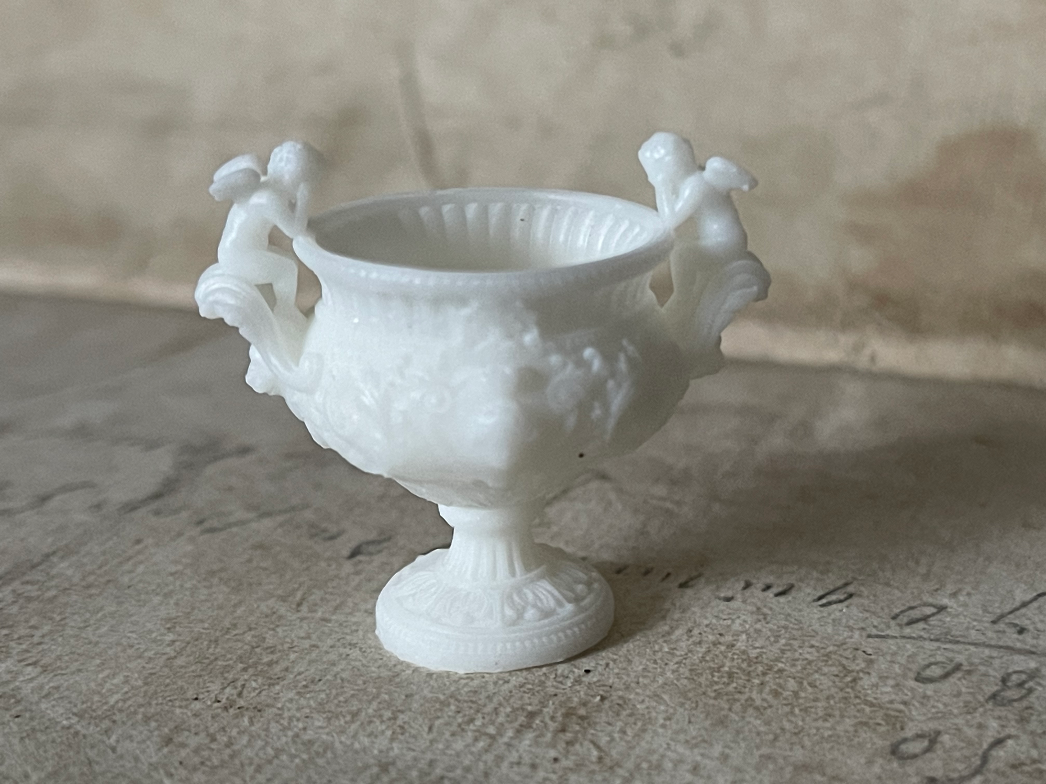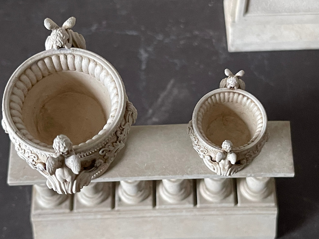 Dit zeer iconische ontwerp van een vaas met twee engeltjes aan beide uiteinden heeft een meer sierlijke twist gekregen door een meer decoratieve vaas te creëren waarop ze zitten.